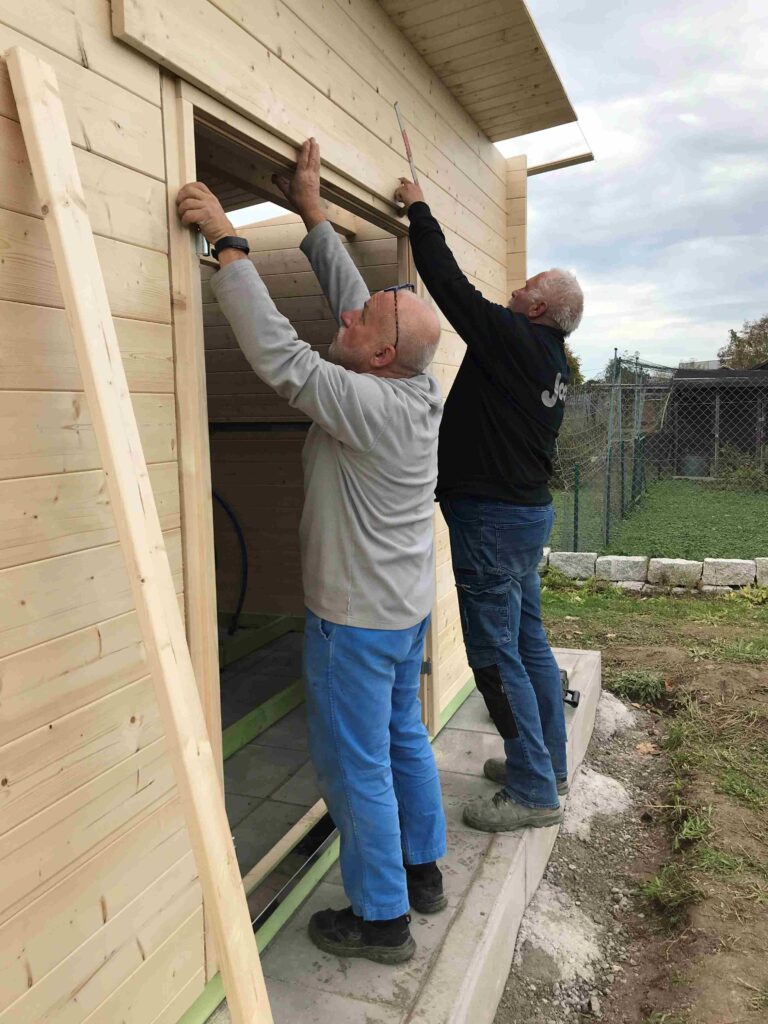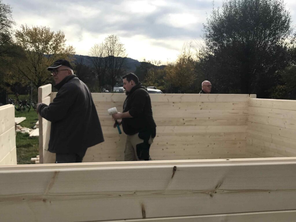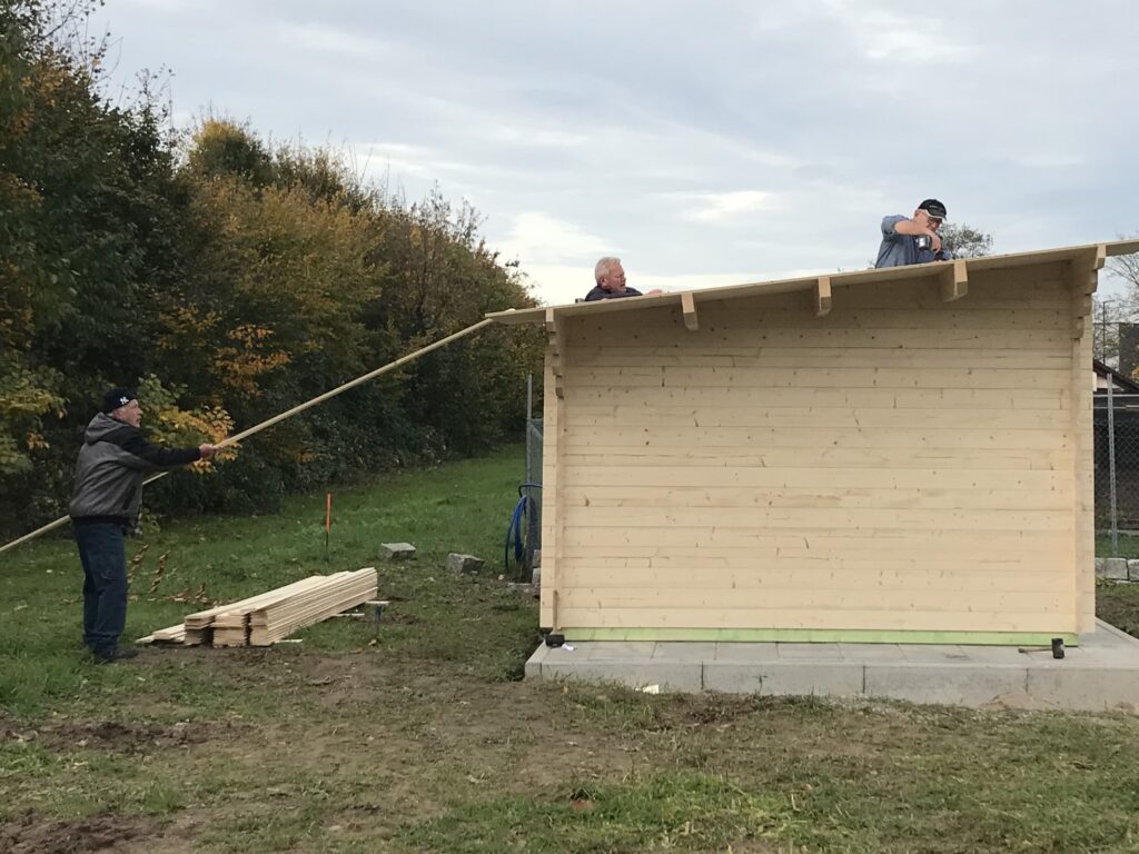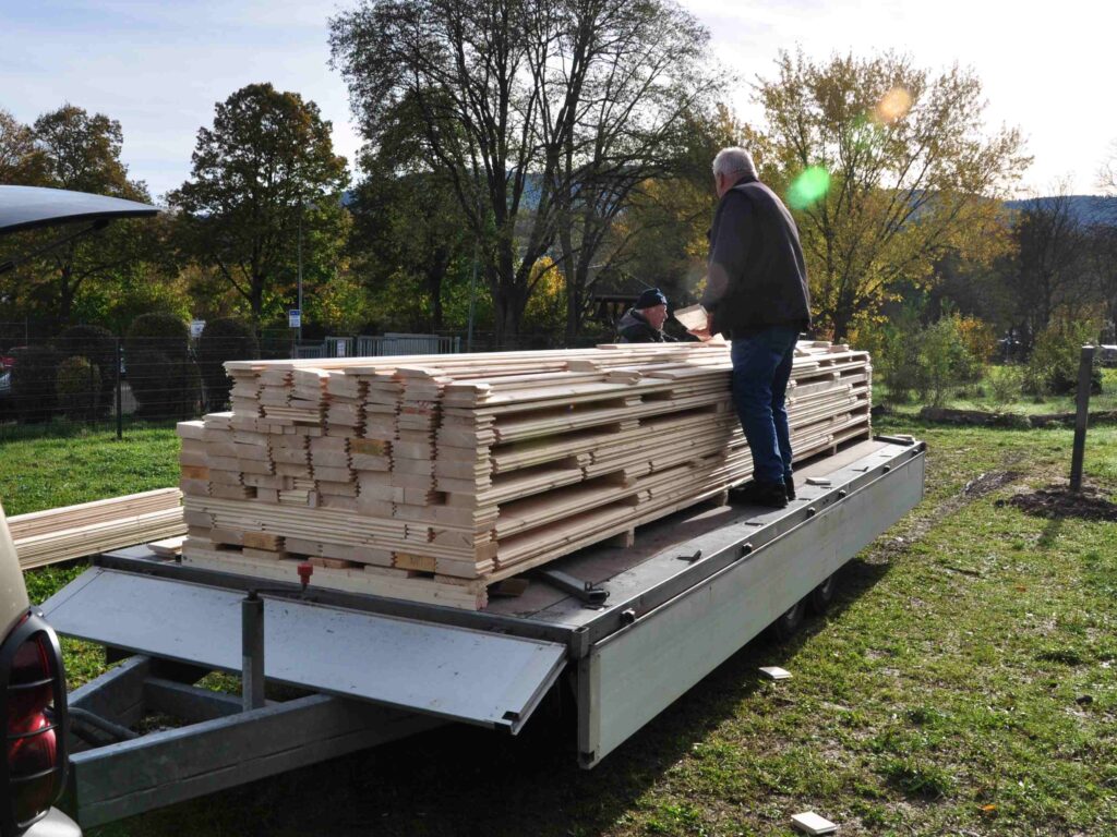 Die erste Arbeitseinheit war der Aufbau des Bodengerüstes, da musste alles stimmen. Es folgte die unterste Reihe der Wandbretter und danach ging es weiter wie mit Lego bauen, bis zu der Höhe des Daches. Die drei Dachbalken, die schwersten Teile, kamen an ihren Platz und alles hat wunderbar ineinander gepasst.