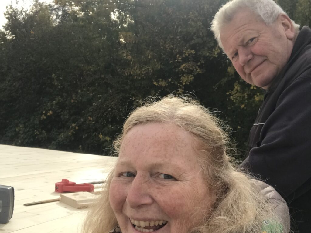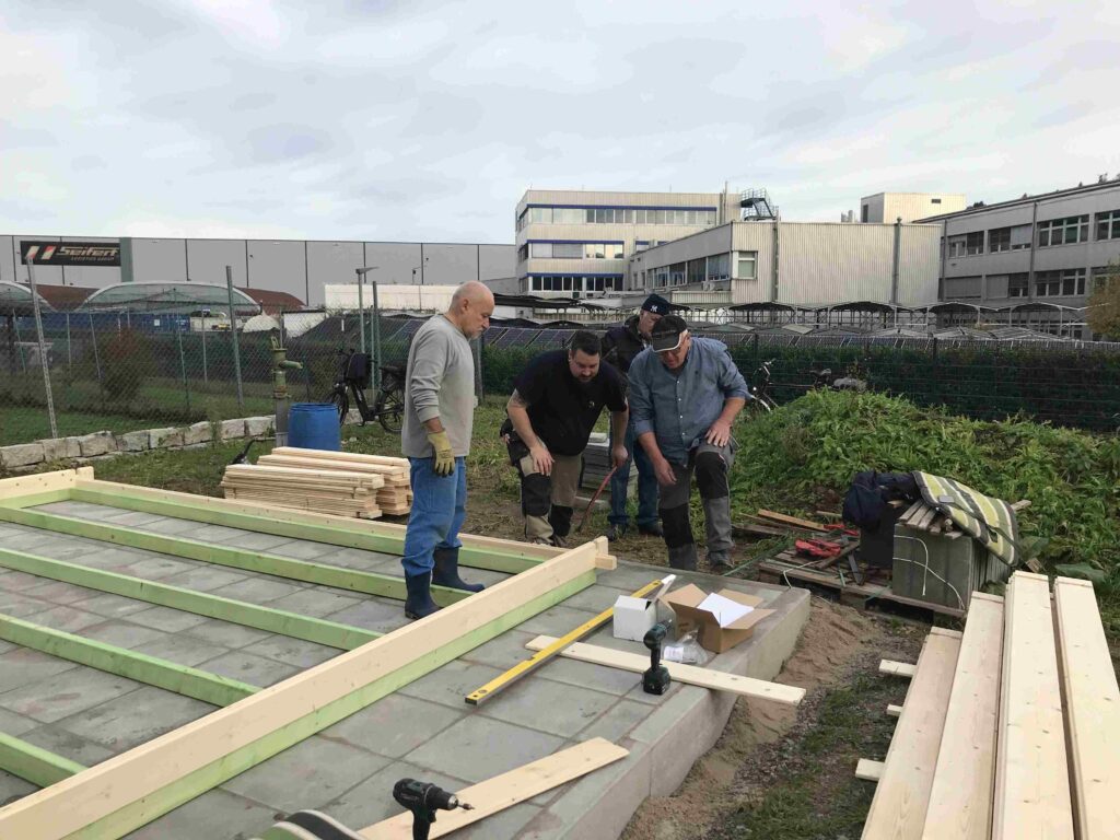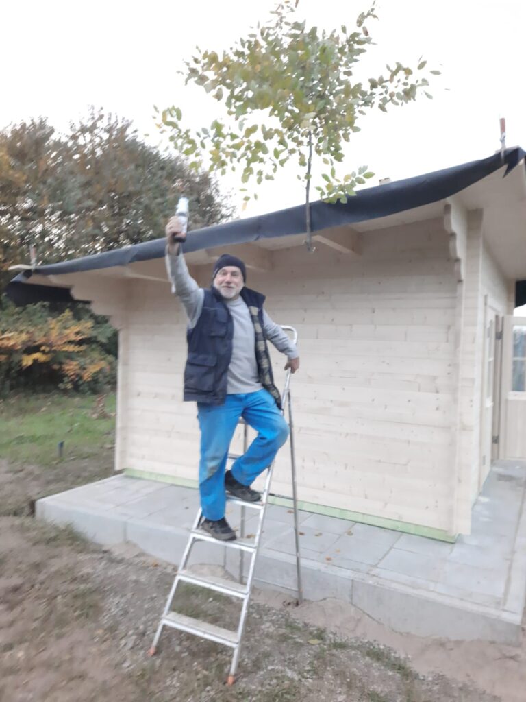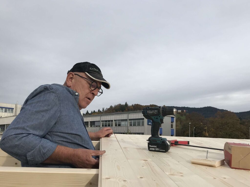 Die erste Arbeitseinheit war der Aufbau des Bodengerüstes, da musste alles stimmen. Es folgte die unterste Reihe der Wandbretter und danach ging es weiter wie mit Lego bauen, bis zu der Höhe des Daches. Die drei Dachbalken, die schwersten Teile, kamen an ihren Platz und alles hat wunderbar ineinander gepasst.