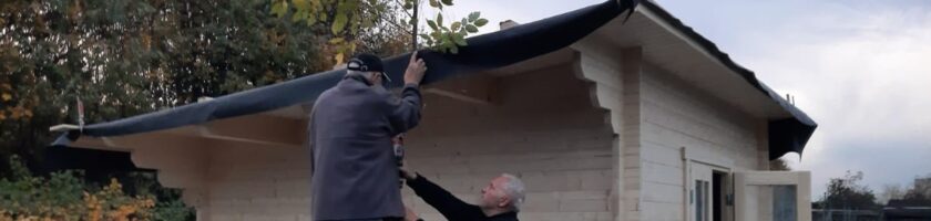 Als nächstes wurden die Dachlatten angebracht und das war ein schöner, luftiger Arbeitsplatz. Martin und Winfried haben währenddessen die Tür und den Rahmen vormontiert. Ganz wichtig war es, dass die Folie noch auf das Dach kam, und jetzt ist unsere Hütte zumindest von oben wetterfest.